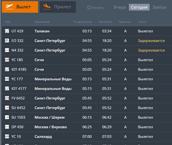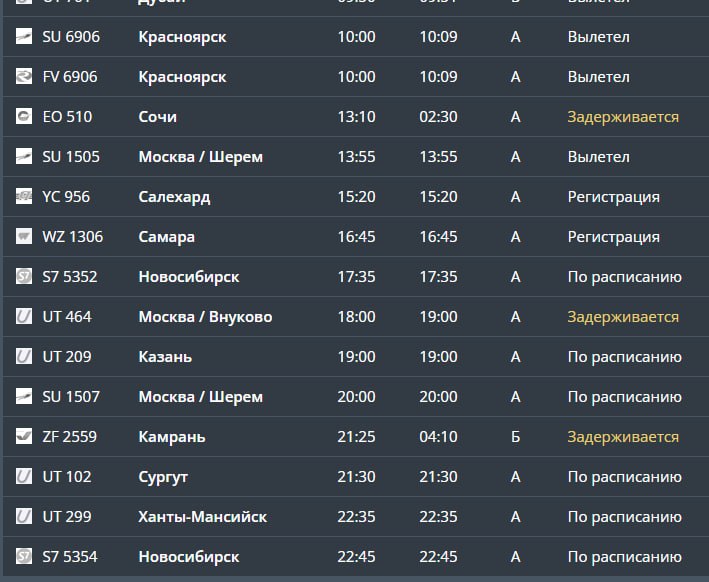 В Рощино задерживается несколько вылетов. Проблемы возникли с рейсами в Санкт-Петербург и Сочи. На данный момент время задержки первого почти 13 часов, второго более 10 часов.