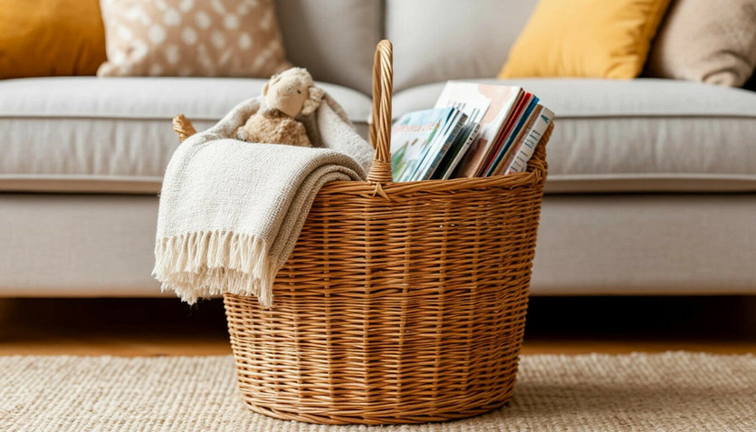 Ваша первая задача — убрать визуальный шум. Возьмите большую корзину или сумку. Пройдите по маршруту: прихожая — гостиная — кухня. Быстро собирайте все вещи, которые не должны быть на виду: одежду, журналы, игрушки, пульты. Не тратьте время на расставление по местам — просто соберите это в одну емкость и временно уберите в шкаф или кладовку.