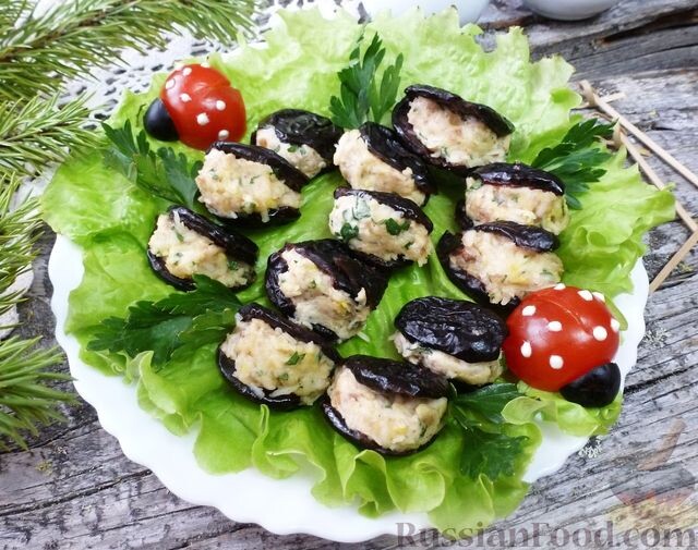 - Закуска из чернослива с сыром и орехами. Эта оригинальная закуска порадует гостей своим необычным вкусом и простотой в приготовлении. Чернослив фаршируется сочетанием сыра, чеснока и грецких орехов — получается так вкусно, что хочется пробовать еще и еще.