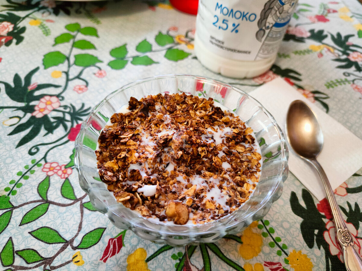 Завтрак: Начало дня с шоколадной гранолы, запечённой с бананом и молоком, обещало заряд бодрости. Как дополнение — бутерброды с домашним куриным рулетом и салатом, заправленные пикантной горчицей.