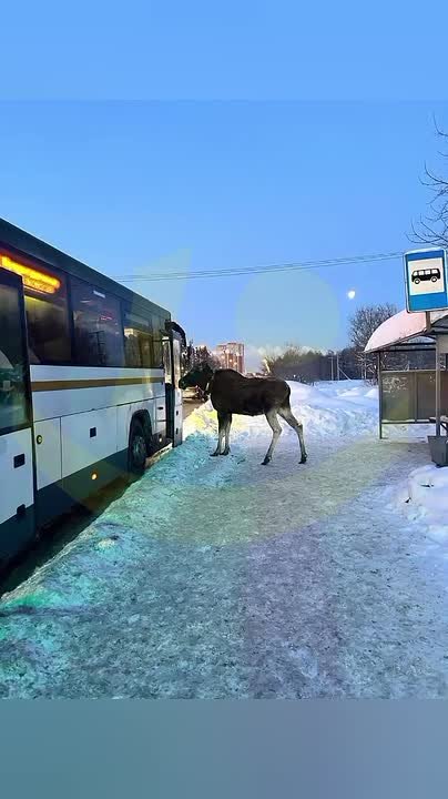 Возможно, услышав призывы пользоваться общественным транспортом в условиях низких температур, лось сначала дождался автобуса на остановке, а затем даже попытался зайти в салон.
