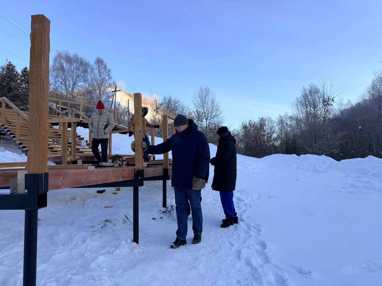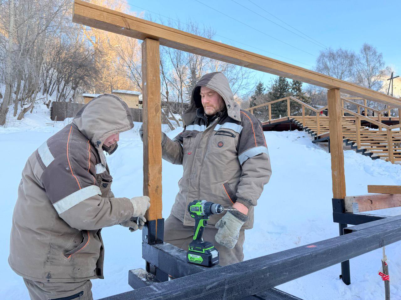 Монтаж деревянного помоста и лестницы от Казачьего взвоза. Прошло три недели прогресс налицо: металлокаркас уже протянут на всю длину, продолжаем укладку деревянного настила выглядит эстетично. Параллельно расчищаем поросль, оставляя крепкие деревья чтобы в итоге получился ухоженный, но естественный зеленый маршрут. Работа продвигается хорошо.