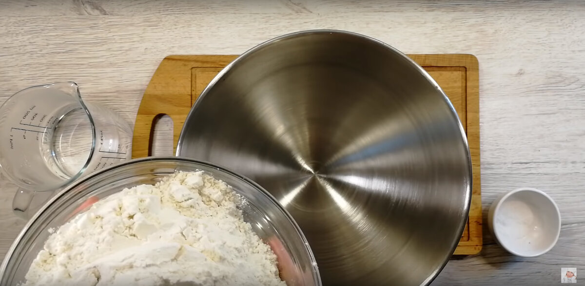 Пока готовятся ингредиенты, необходимо замесить тесто. В чашу миксера помещается мука и соль. После того как все перемешано, медленно добавляется теплая вода. Степень замеса должна напоминать тесто для пельменей. Готовую массу следует завернуть в пакет и оставить на 30 минут, чтобы тесто стало более эластичным.