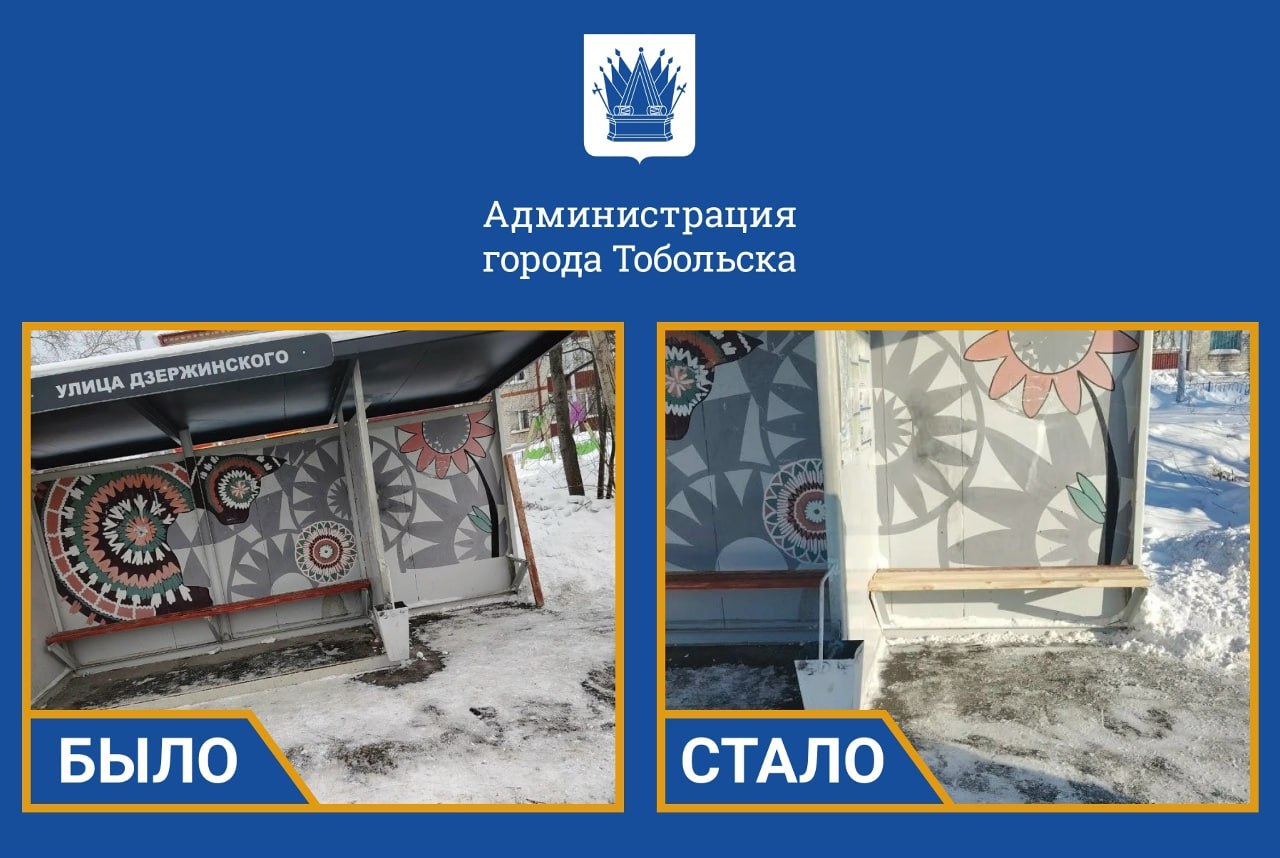 Сотрудники подрядной организации провели ремонт лавочки на остановочном павильоне "Улица Дзержинского".