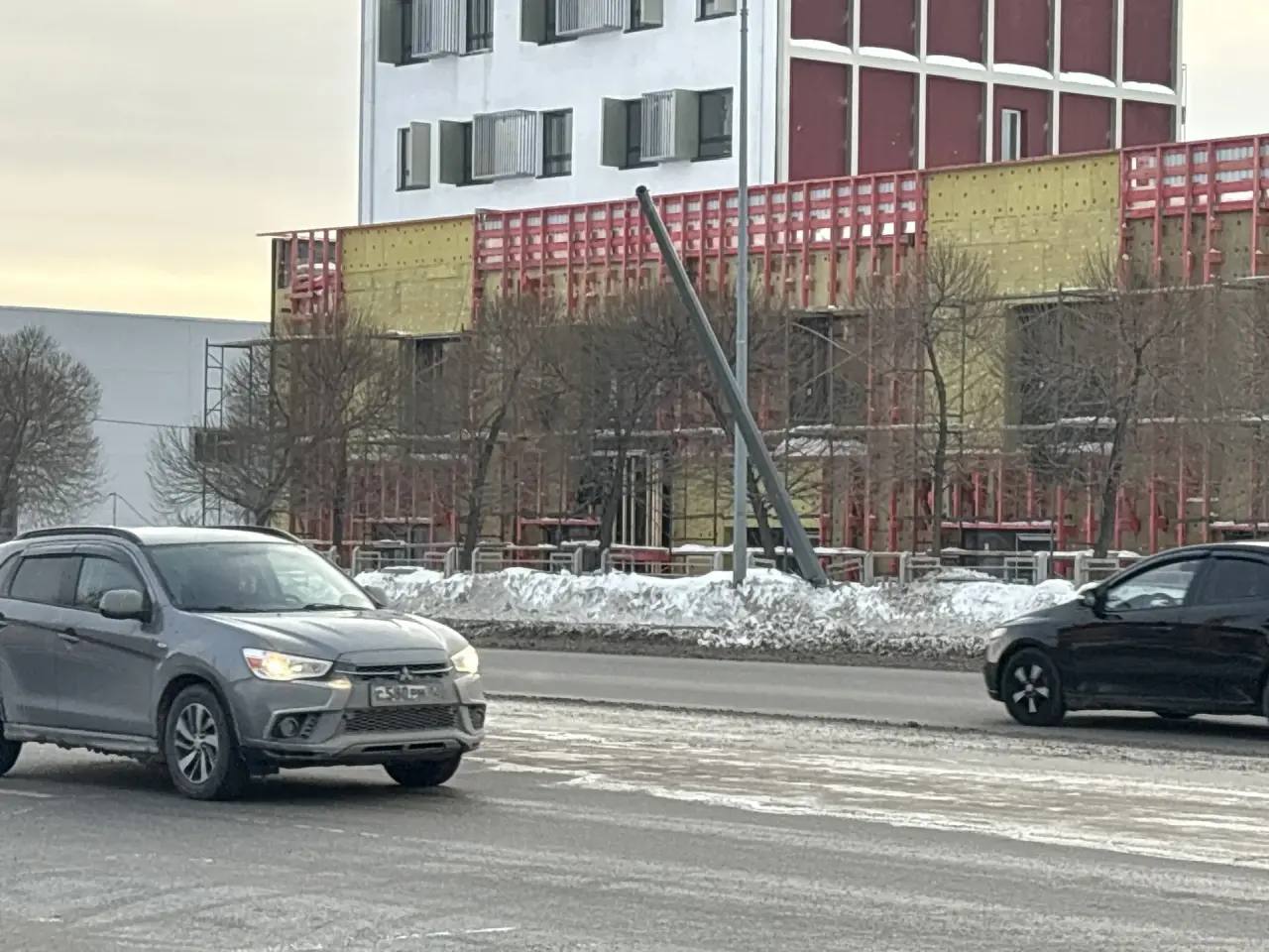 В Тюмени напротив ТЦ Панама мусоровоз снес трос с дублирующими дорожными знаками. Из-за сильного удара опоры, на которых крепилась растяжка, заметно накренились.