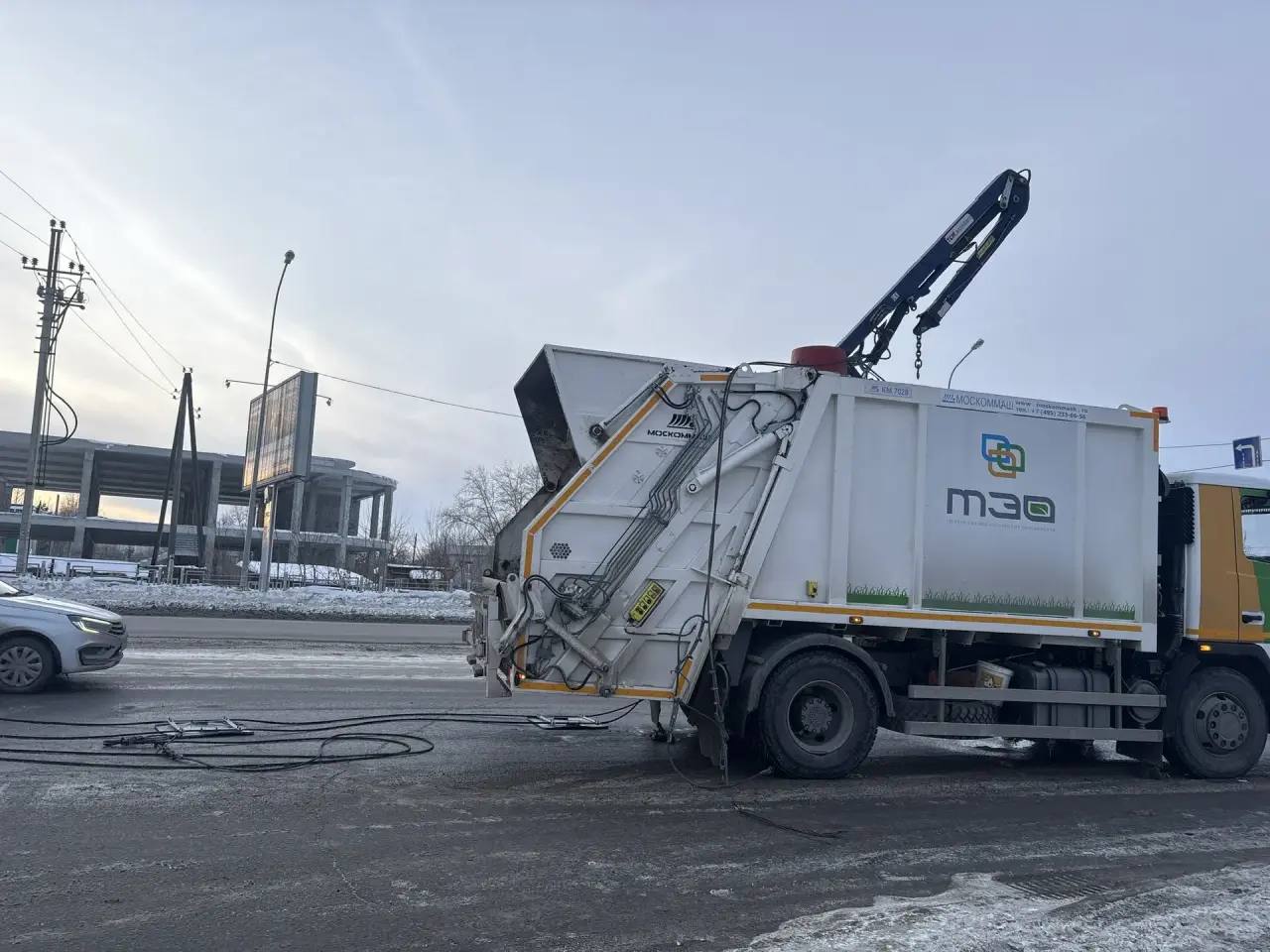 Причина происшествия — невнимательность водителя, который забыл опустить манипулятор спецтехники перед началом движения.