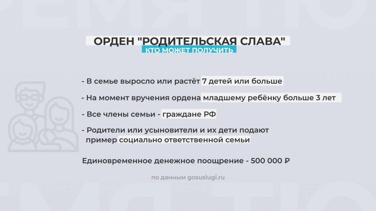 Им награждаются родители или усыновители, которые воспитывают или воспитали семерых и более детей. При этом самый младший ребёнок должен быть не младше 3 лет. Все члены семьи - граждане Российской Федерации.