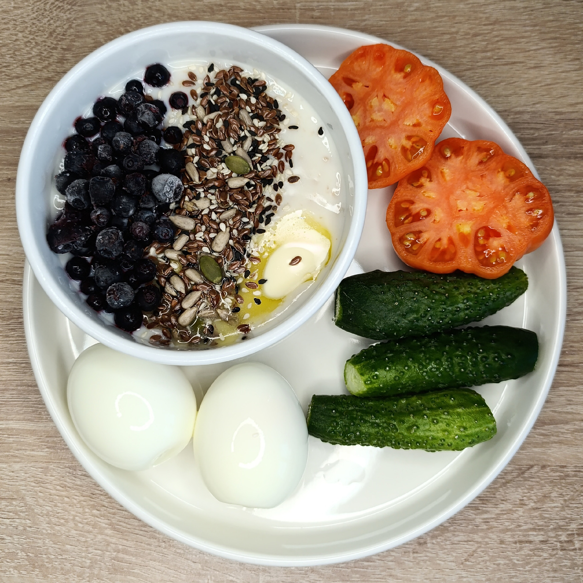 Вес продолжает постепенно снижаться благодаря увеличению физической активности. Надежда на то, что эта тенденция сохранится, становится все более реальной. Завтрак, как всегда, стал важным этапом утреннего распорядка. Вчера в обсуждениях на платформе Telegram говорили о разных крупах, и сегодня на завтрак была приготовлена геркулесовая каша, дополненная семечками, маслом и свежей черникой. В качестве дополнения были поданы яйца-пятиминутки, нарезанные домашние огурчики и помидоры, а также кофе с молоком.