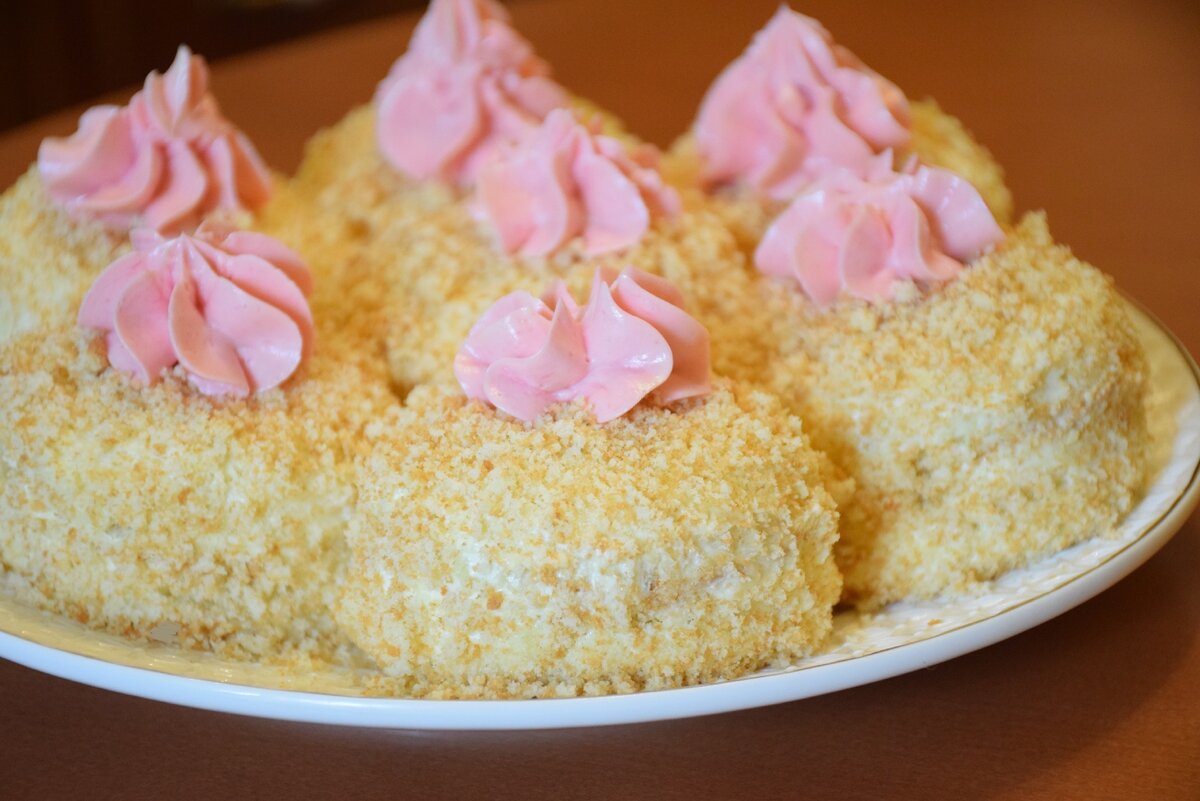 Обвалять пирожные в приготовленной крошке, украсить остатками крема, если есть.