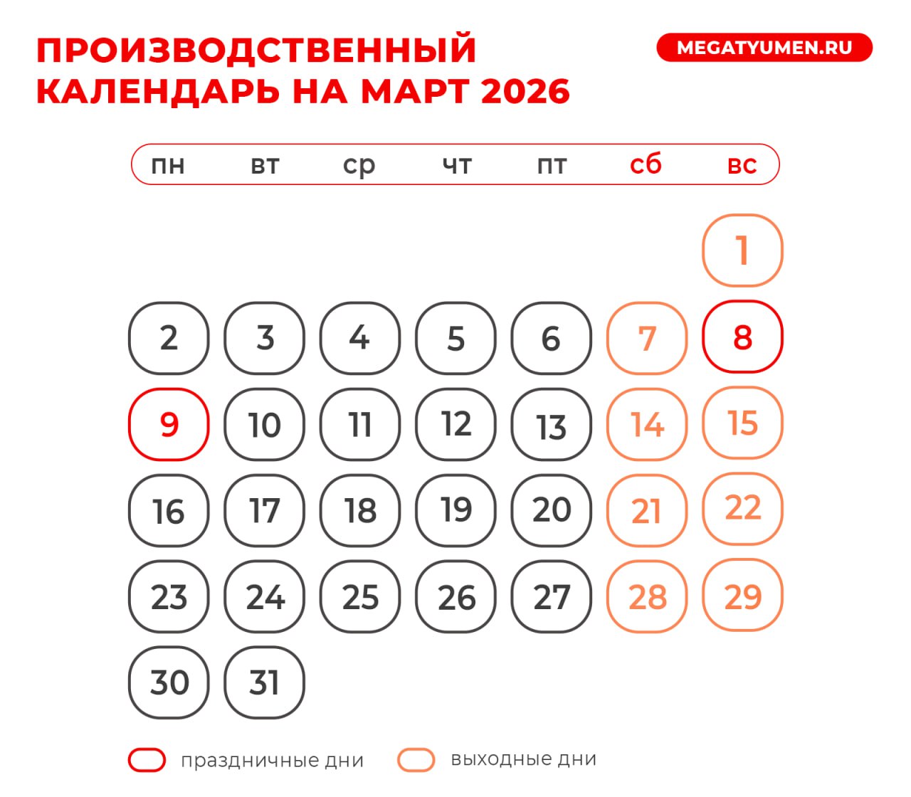 Всего в первый весенний месяц будет 21 рабочий и десять выходных и праздничных дней.