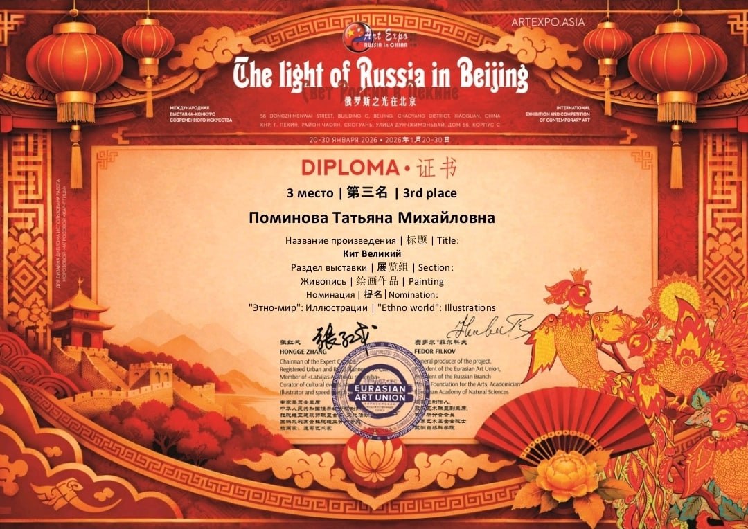Поздравляем нашу землячку художницу Татьяну Поминову с 3-м местом на Международной выставке-конкурсе современного искусства «Свет России в Пекине». Выставка открылась 23 января 2026 года в Российском культурном центре в Пекине.