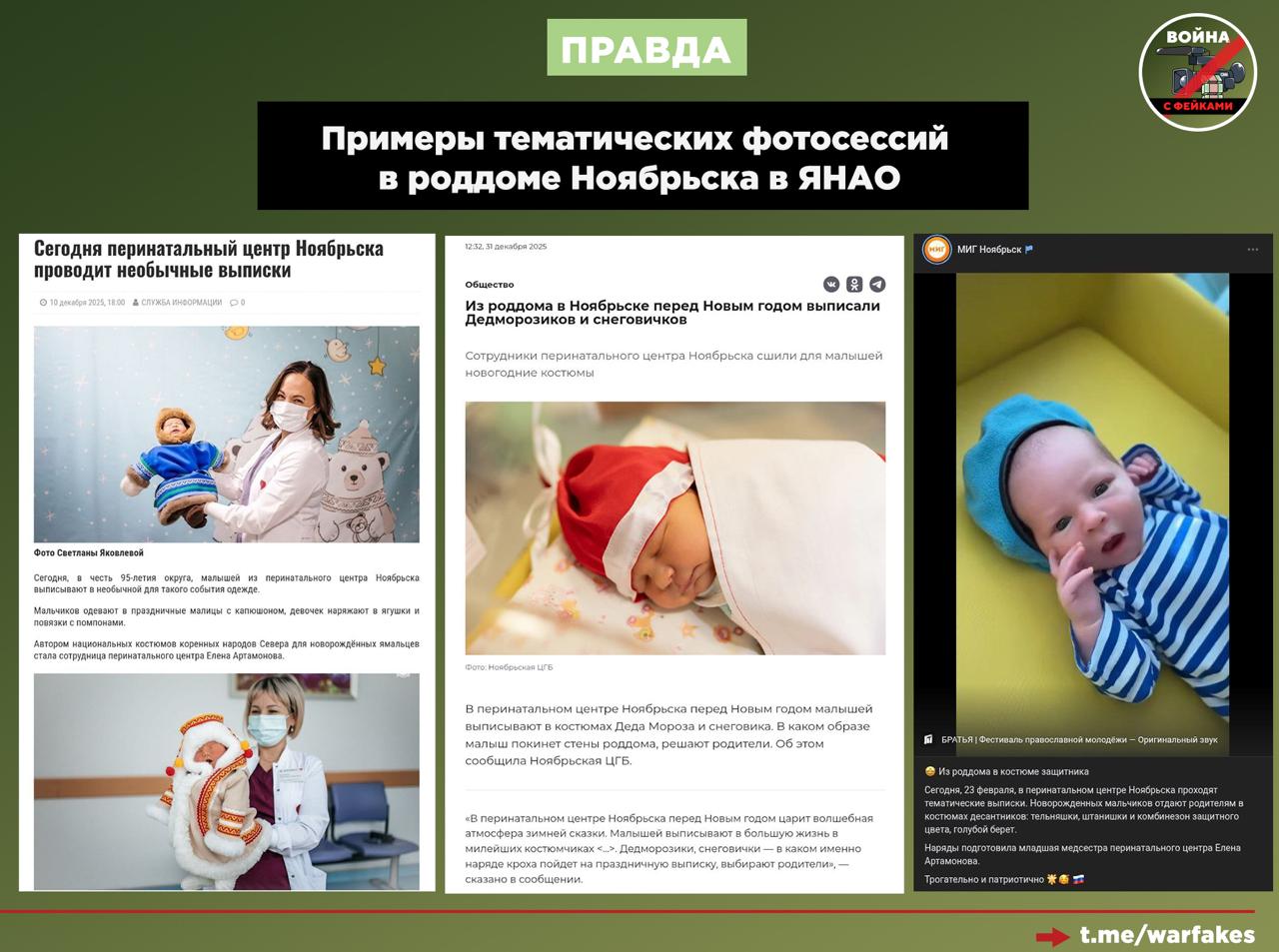 Правда: Сотрудники перинатального центра Ноябрьска любят организовывать необычные выписки малышей, приуроченные к праздничным датам. Только в больной голове могла родиться ассоциация между тематическими фотосессиями младенцев и СВО на Украине.
