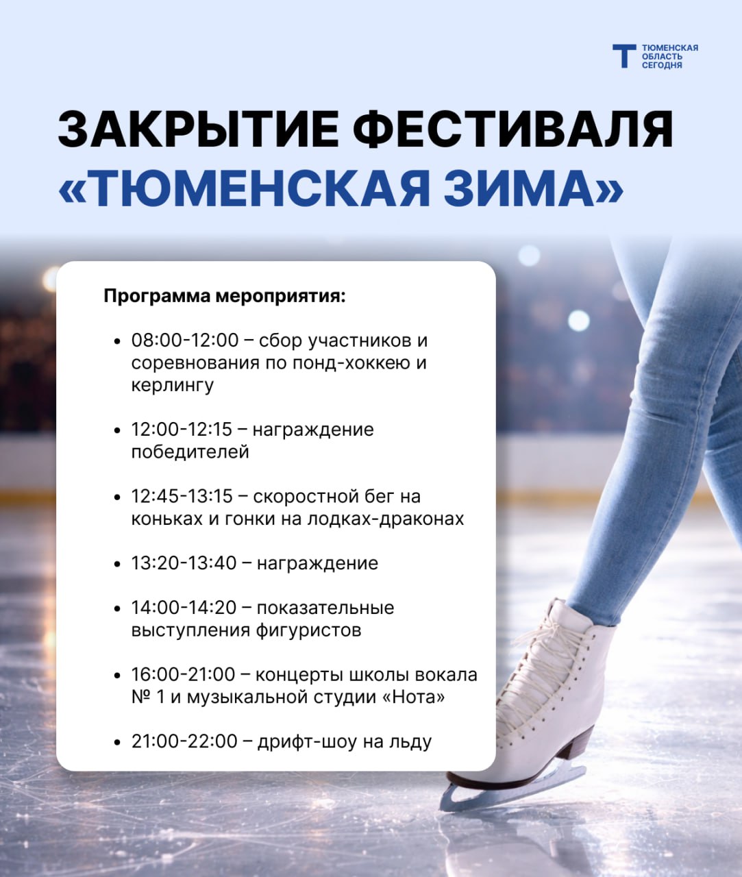 Праздник состоится 28 февраля на катке «Сердце Тюмени: Комарово Парк». Гостей ждут соревнования по хоккею и керлингу, скоростной бег на коньках, гонки на лодках-драконах и показательные выступления фигуристов. Завершится вечер дрифт-шоу.