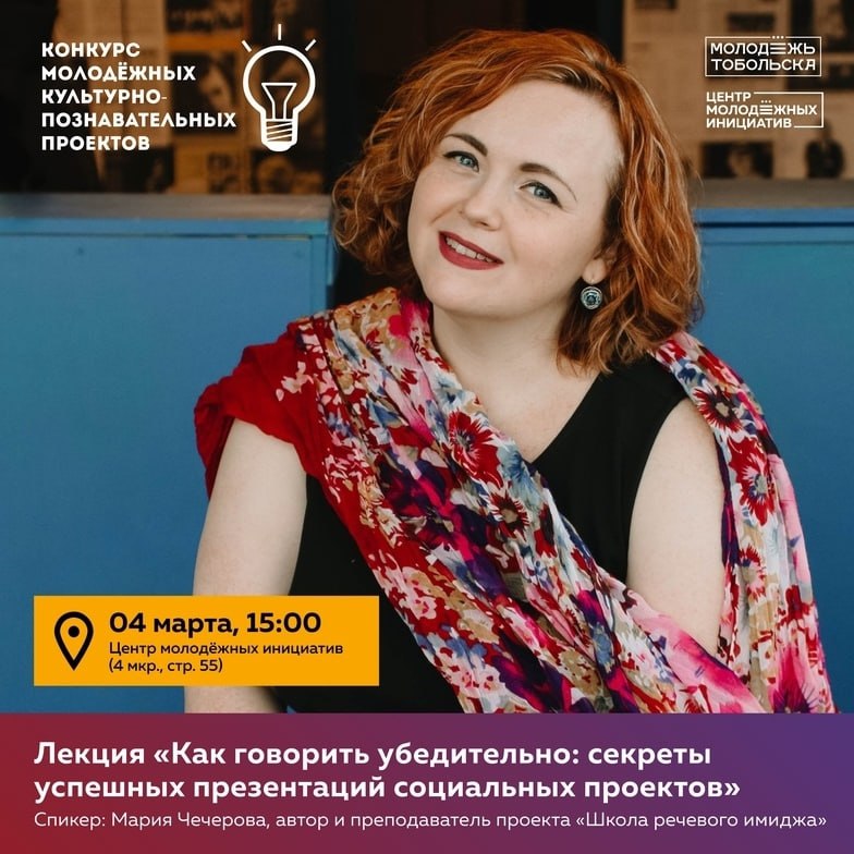 4 марта в 15:00 в Центре молодёжных инициатив (4 мкр., стр. 55) состоится лекция «Как говорить убедительно: секреты успешных презентаций социальных проектов». В качестве спикера будет выступать Мария Чечерова — автор и преподаватель проекта «Школа речевого имиджа», преподаватель театральных дисциплин высшей категории Отделения искусств и культуры им. А.А. Алябьева.