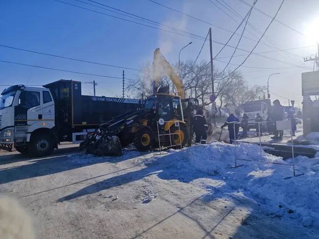 Труба, которую надо починить, проложена на большой глубине. Чтобы добраться до места повреждения, мерзлый грунт долбят тяжелым экскаватором и гидромолотом.
