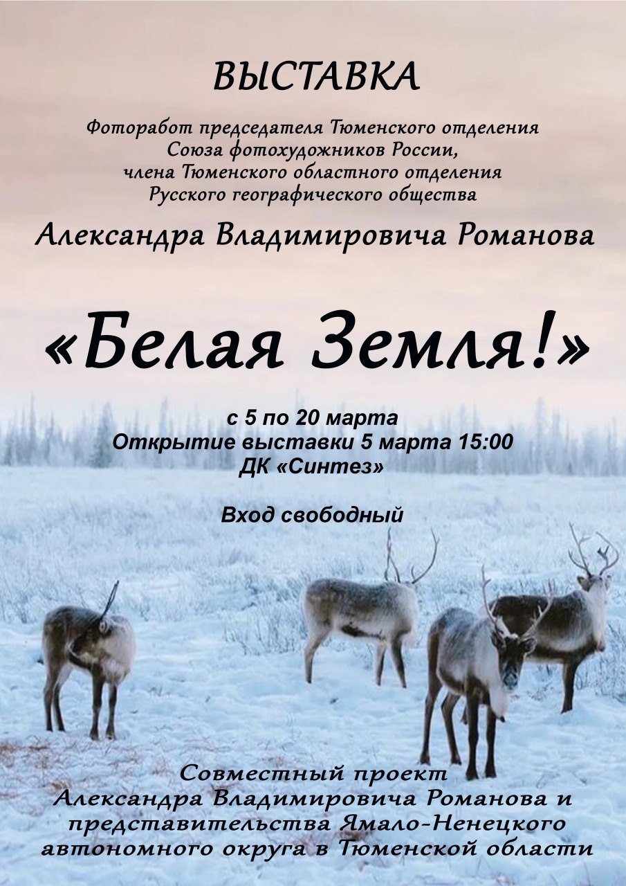 В ДК «Синтез» откроется выставка председателя Тюменского отделения Союза фотохудожников России, члена Тюменского областного отделения Русского географического общества Александра Владимировича Романова.