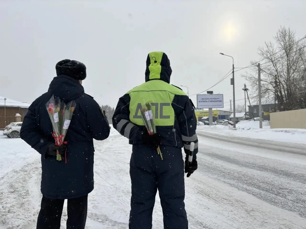 Поздравления продолжаются: автоинспекторы вручают цветочки автолюбительницам