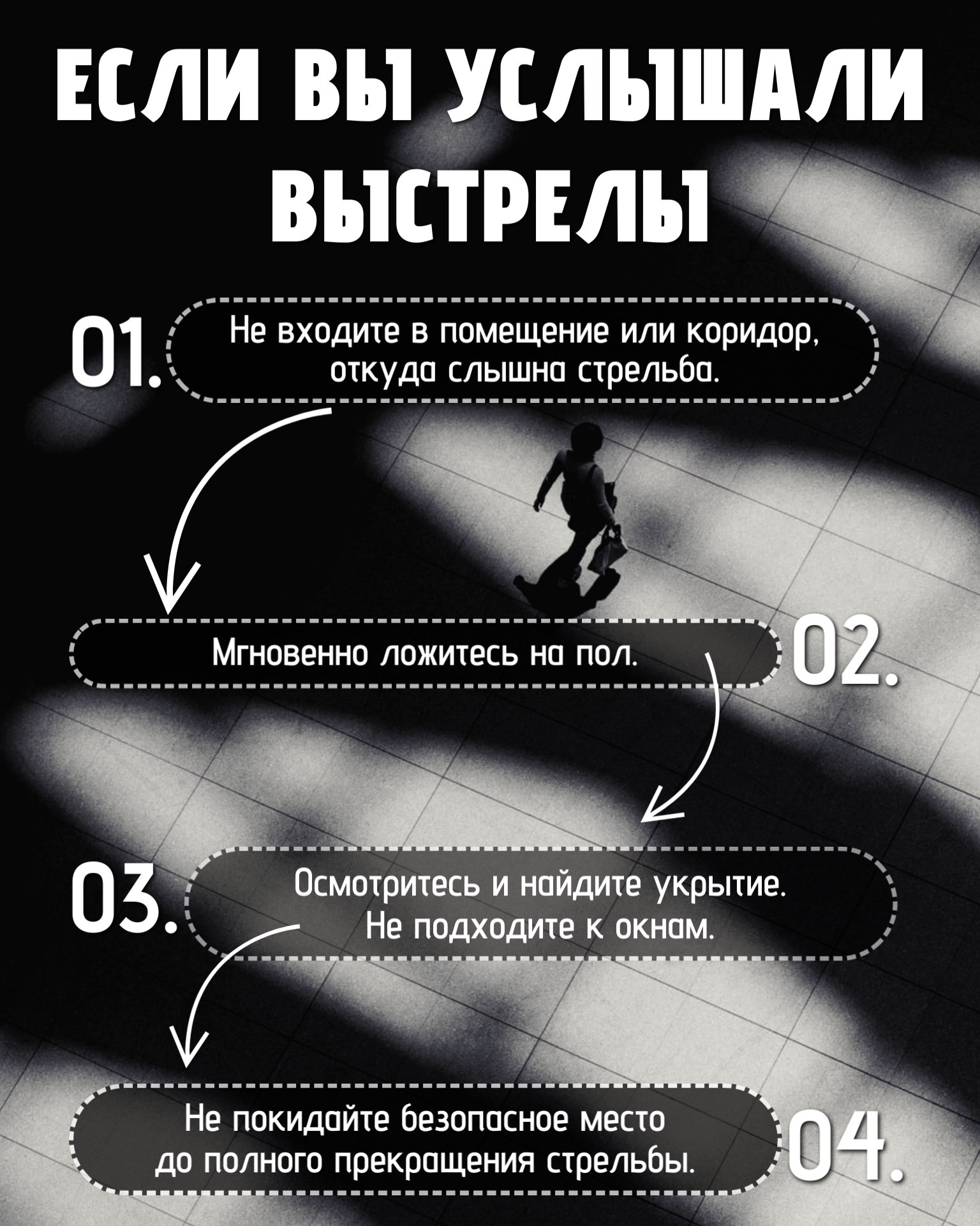 Звуки выстрелов — это сигнал к мгновенным действиям. Многие погибают не от пуль, а от давки или любопытства, когда подходят к окнам.