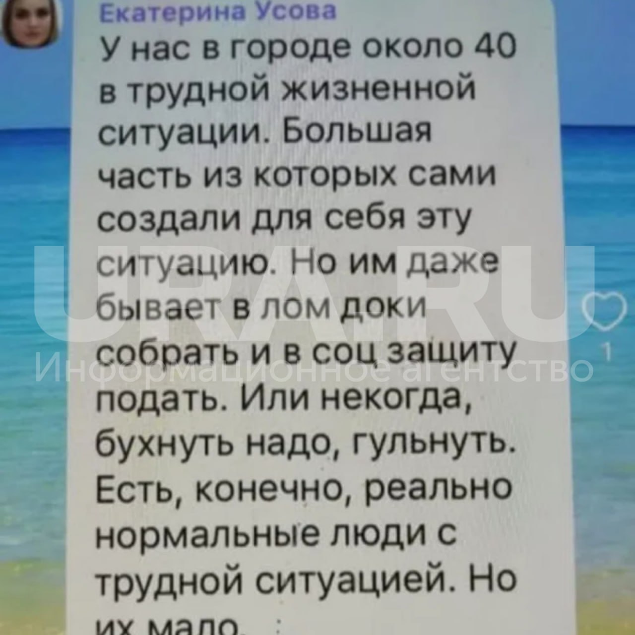 Кроме этого, Усова прославилась на Урале еще одним громким делом. В 2019 году она заявила, что, по ее мнению, помогать стоит только «нормальным инвалидам», «коих меньшинство, а остальным нужно лишь „гульнуть и бухнуть“».