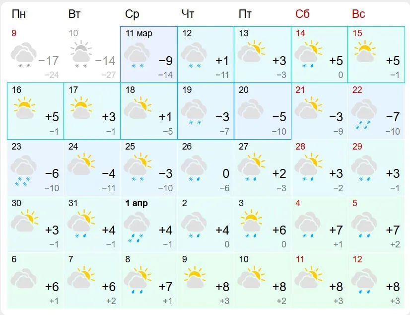 Так, по прогнозам местных синоптиков, уже завтра, 12 марта, столбики термометров покажут 1 градус выше нулевой отметки, в пятницу +3. Следующие три дня будут по-настоящему ранневесенние: температура наружного воздуха составит 5 градусов тепла.