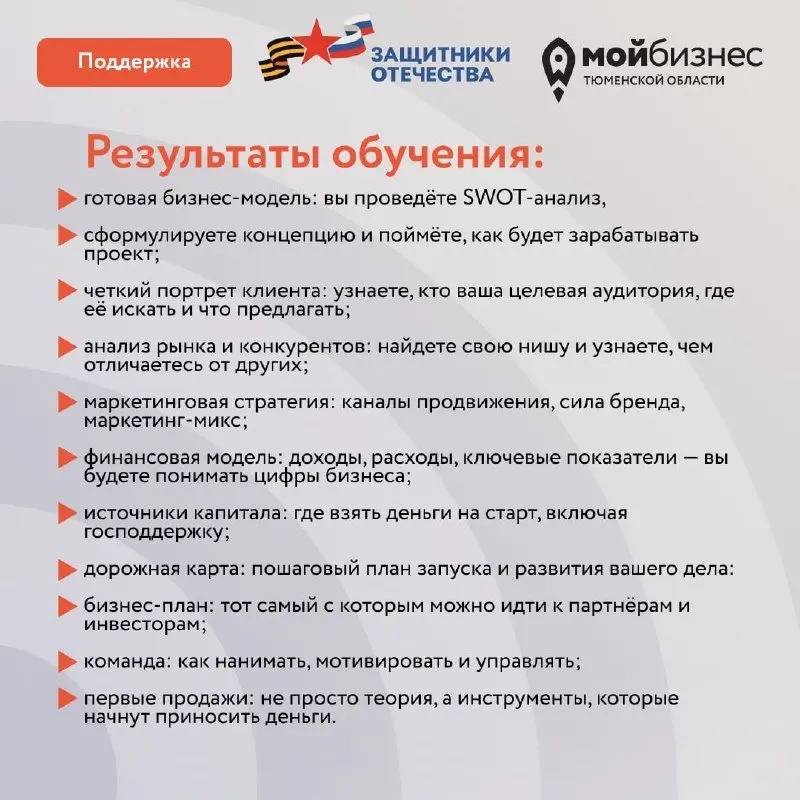 На двухнедельном интенсиве для участников СВО и ветеранов боевых действий спикеры расскажут, как начать заниматься предпринимательской деятельностью. В рамках обучения пройдут семинары, лекции и мастер-классы.