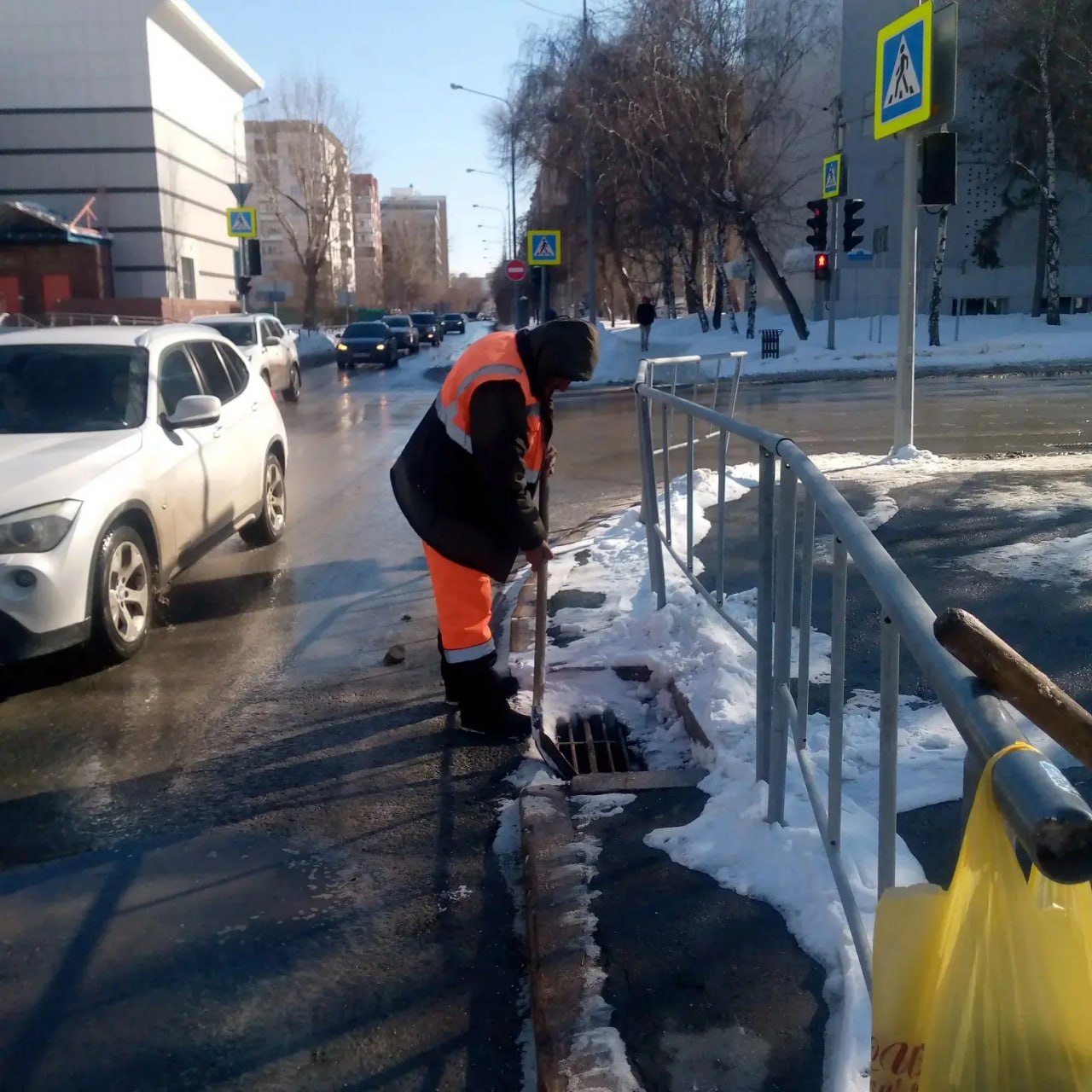 Когда снег сменяют весенние ручьи, работы у дорожников прибавляется! Нужно не только продолжать вывозить снежные кучи с городских территорий, но производить очистку дождеприемных колодцев и ливневых решеток вдоль дорог.