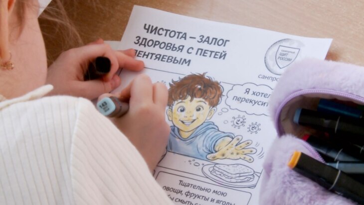 Также ребятам вручили тематические раскраски с постоянным героем «Санпросвета» — Петей Лентяйкиным.
