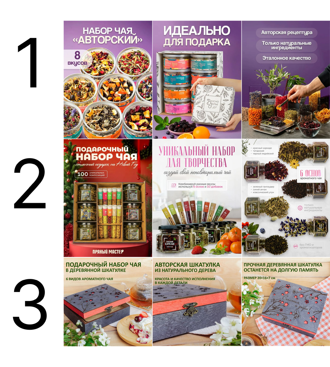 Четвертые наборы, несмотря на интересный подход с деревянной коробкой, недостаточно акцентируют внимание на самом чае. Упаковка второго набора, казалось бы, должна быть яркой и запоминающейся, однако отсутствует четкая идея, что именно предлагается. "Пряный мастер" может звучать интригующе, но оформление не подчеркивает уникальности товара, что снижает его привлекательность.
