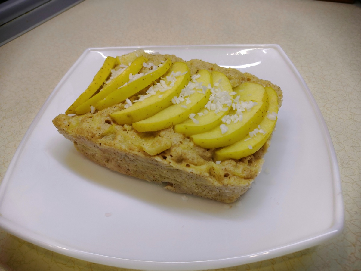 3. Запекание: Выложить тесто в посуду для микроволновки. Сверху украсить яблочными слайсами. Запекать в микроволновке на мощности 700 Вт в течение 4 минут. По желанию, посыпать кокосовой стружкой для оформления.