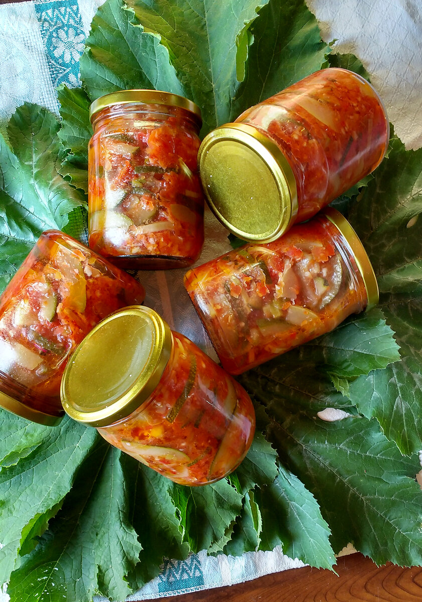 После того как все ингредиенты перемешаны, массу нужно варить на среднем огне около 30 минут после закипания. После этого закуску разливают по заранее подготовленным стерильным банкам и закатывают. Закуска готова к употреблению, и ее вкус непременно порадует всей семье.