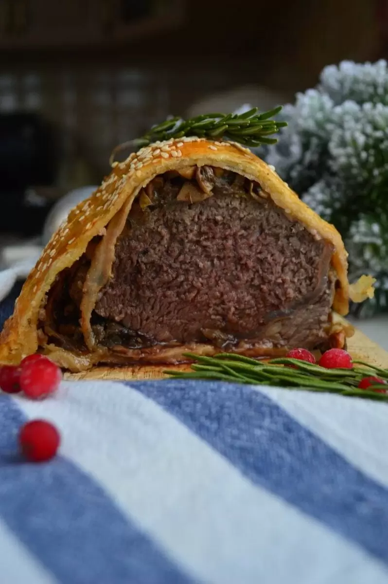 Говяжья вырезка, запеченная под аппетитной корочкой слоеного теста с ароматными грибами и беконом, — это великолепное блюдо, которое украсит любой праздничный стол.