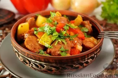 - Овощное рагу: лук, бекон, картофель, колбаса, кабачки, сладкий перец, томатное пюре и специи.