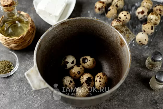 Тем временем, поставьте вариться перепелиные яйца: достаточно 4 минут после закипания. После этого яйца охладить и аккуратно очистить. В вашем салате они станут настоящим украшением.