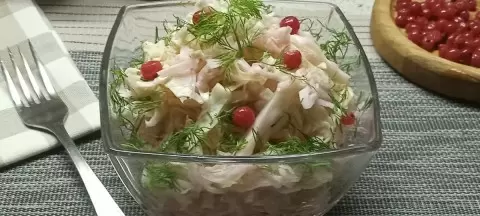 Когда рассол с добавлением красной смородины немного остынет, капусту можно подавать к столу. Выложить готовое блюдо в салатник, заправить растительным маслом, посыпать укропом и наслаждаться уникальным вкусом!