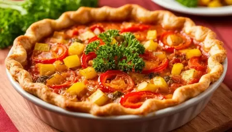 Этот яркий пирог — идеальное угощение для выходных! Кто не любит ощущение свежей выпечки, наполняющее дом ароматом комфорта? Сочетание хрустящего теста, нежной сливочной заливки и запеченных овощей создаёт не просто блюдо, а настоящий уютный момент за столом. Пирог впечатляет своей простотой в приготовлении и дарит удовольствие в каждом кусочке.