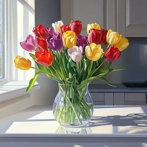 Не забывайте менять воду каждые два дня и очищать вазу, чтобы уничтожить бактерии. Для цветов с молочным соком, таких как мак или пуансеттия, кратковременно обрабатывайте срез кипятком, чтобы сок не испортил букет. Тюльпаны предпочитают очень холодную воду, иногда даже с добавлением льда.
