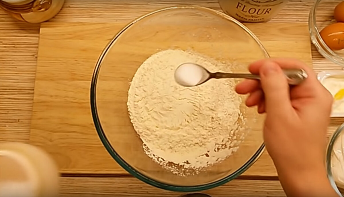 Начнем с приготовления теста для пирогов. В глубокой миске смешиваем стакан муки первого сорта и стакан цельнозерновой муки. Необходимо добавить полчайной ложки соды и чайную ложку сахара, чтобы тесто получилось воздушным. В то время как тесто остывает, можно перейти к созданию начинки.