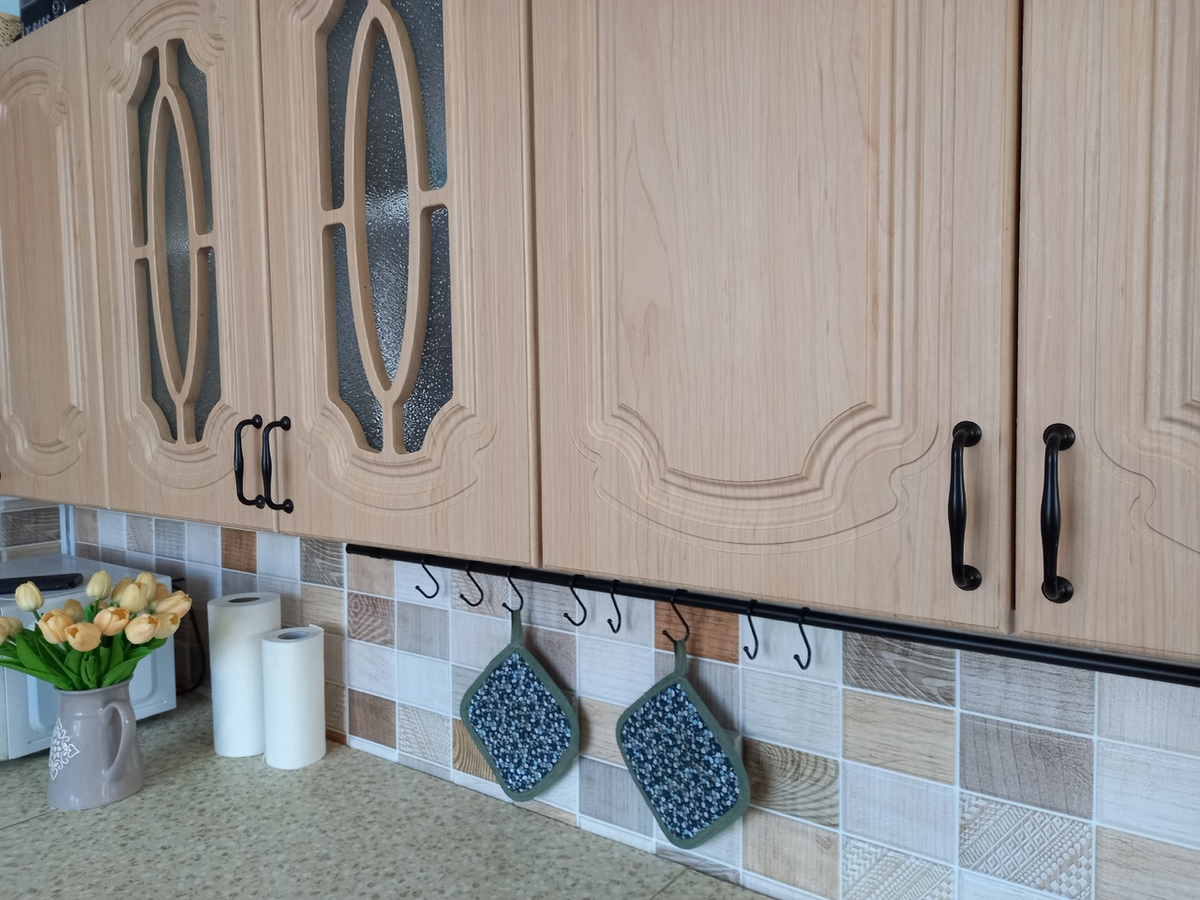 - Замена ручек на шкафах: старые пластиковые ручки пришли в негодность, их замена на черные металлические не только улучшила внешний вид, но и добавила удобства.