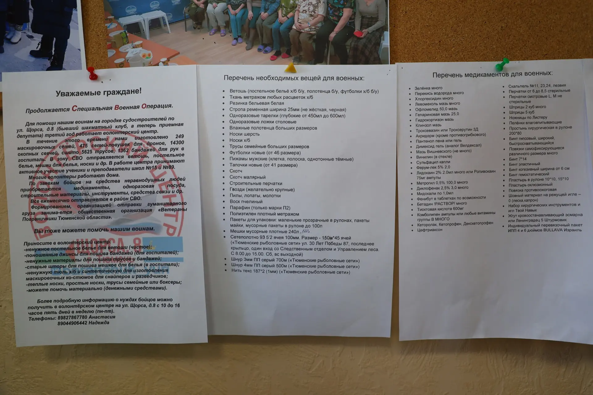 Куратор волонтёрского центра Анастасия Шумилова рассказала про основные направления деятельности: плетение маскировочных и антидроновых сетей, изготовление окопных свечей, пошив нижнего белья и бандажей для госпиталей и, самое главное, сборы по заявкам участников специальной военной операции.