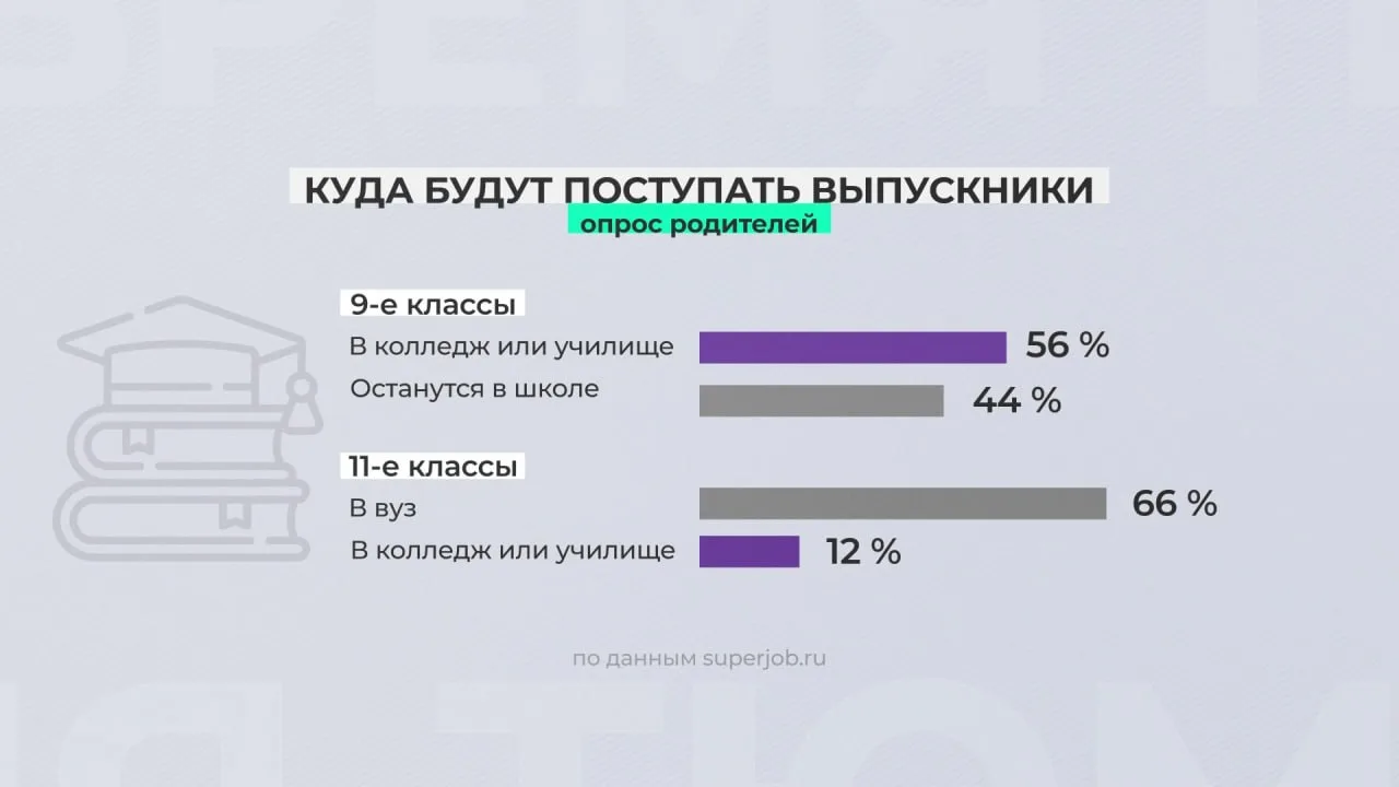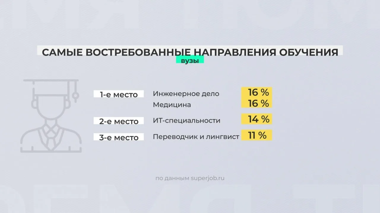Такие данные публикует портал superjob.ru. Среди учеников 11-х классов таких 12 %. Самыми востребованными направлениями в вузах в этом году стали инженерное дело и медицина.