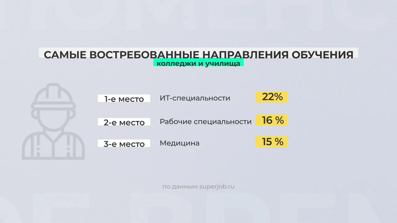 Среди поступающих в колледжи и училища лидером остаётся ИT-направление. 16 % родителей заявили, что дети будут осваивать рабочие специальности в строительстве и производстве. На третьем месте по популярности - медицина.