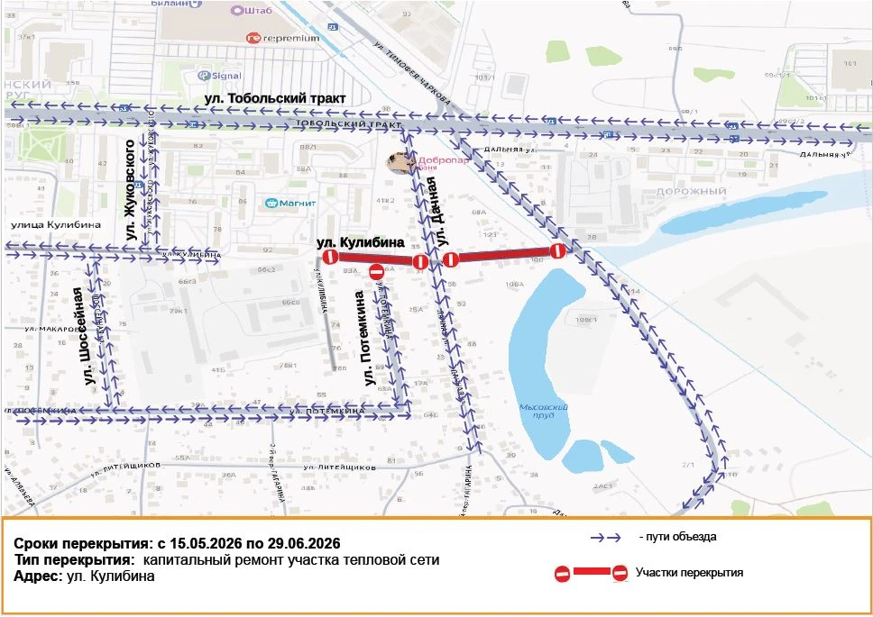 Возможные маршруты объезда: ул. Дачная, ул. Потемкина, Тобольский тракт.